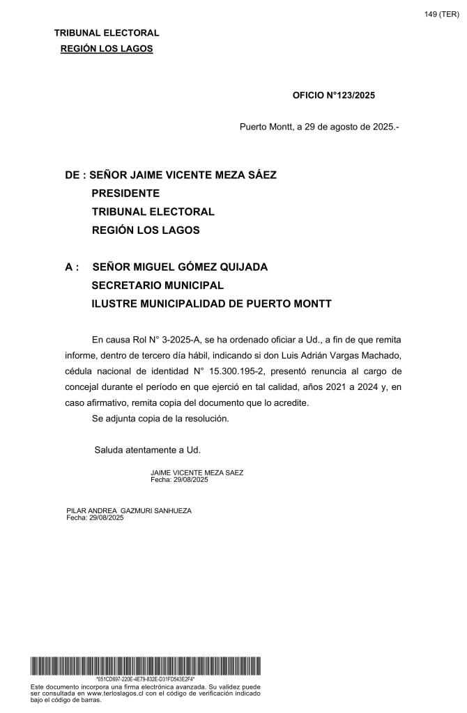 Cabe destacar, que hace unos días, el TER solicitó al Secretario Municipal de Puerto Montt, emita en un plazo de tres días hábiles, algún documento que acredite si Luis Vargas Machado renunció o no al cargo de Concejal durante el anterior periodo municipal.