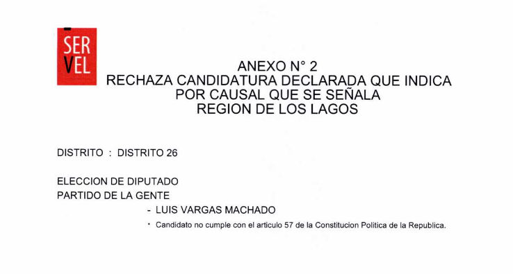 Un golpe para el partido de Franco Parisi, esto debido a la publicación Resolución N° 0408 del Servel, en donde se informaron las candidaturas que fueron aceptadas y las que fueron rechazadas, y en el caso del distrito 26, solo un postulante fue rechazado el exconcejal y exRN, Luis Vargas Machado, quien era de las cartas más competitivas del Partido de la Gente.
